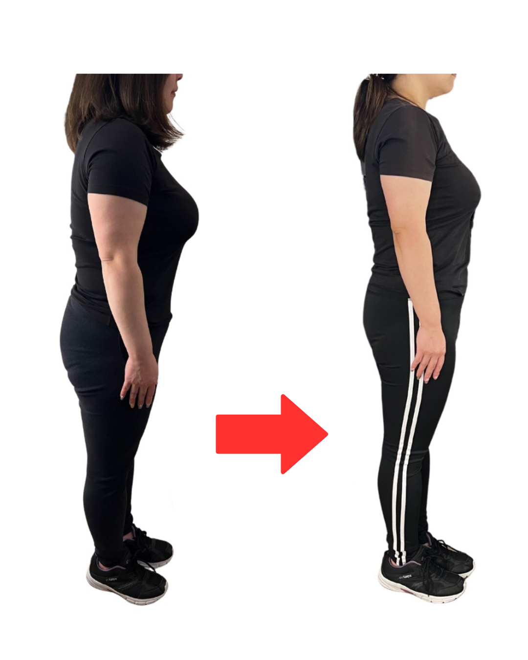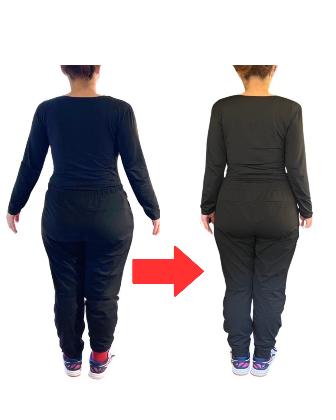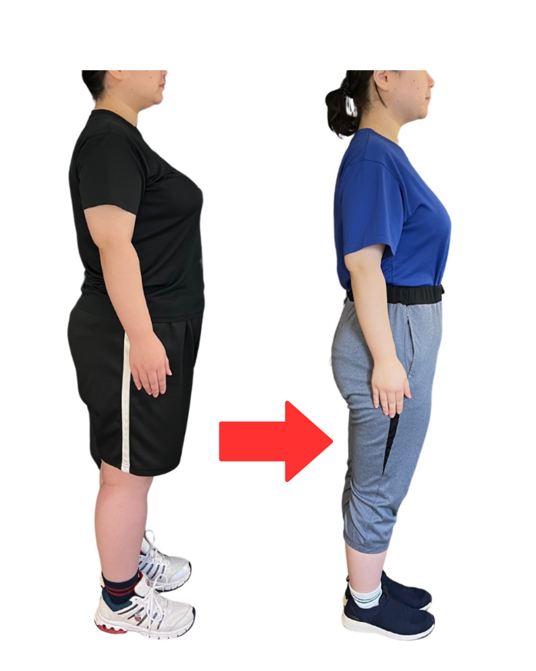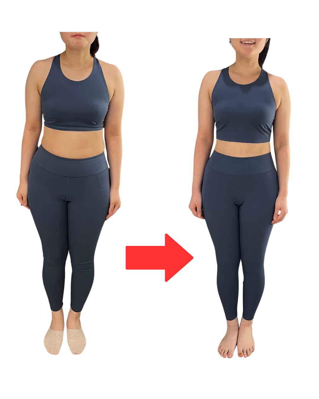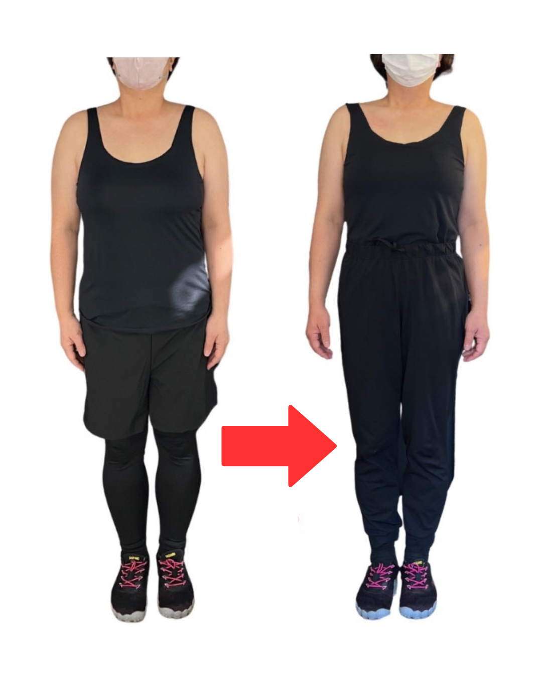 筋力低下からくる腰痛とX脚でしたが、こちらのお身体の変化は1ヶ月のもの。3ヶ月を待たずに腰痛や気になっていたお尻の大きさなど悩みがなくなりました。